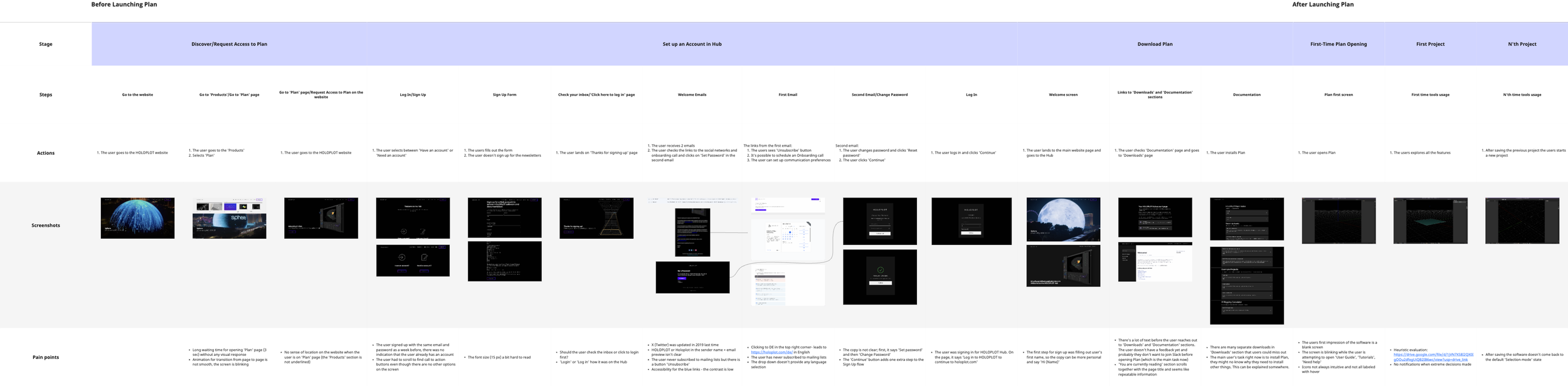 Using the findings, I created a User Journey Map that covers the entire process, from visiting the HOLOPLOT website and setting up an account on HOLOPLOT Hub to downloading Plan and starting to work with the tool and documented users’ pain points at each step.